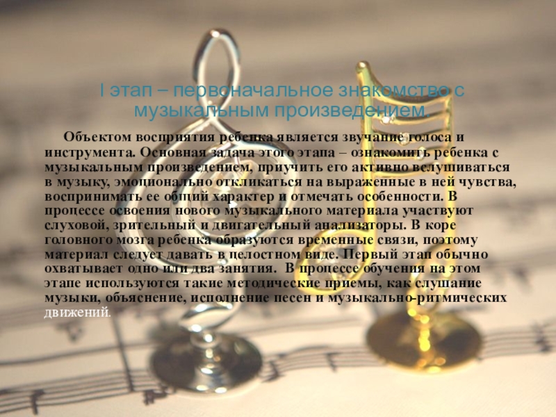 восприятия ребенка является звучание голоса и инструмента. Основная задача этого этапа – ознакомить ребенка с музыкальным произведением, приучить его активно вслушиваться в музыку, эмоционально откликаться на выраженные в ней чувства, воспринимать ее общий характер и отмечать особенности. В процессе освоения нового музыкального материала участвуют слуховой, зрительный и двигательный анализаторы. В коре головного мозга ребенка образуются временные связи, поэтому материал следует давать в целостном виде. Первый этап обычно охватывает одно или два занятия. В процессе обучения на этом этапе используются такие методические приемы, как слушание музыки, объяснение, исполнение песен и музыкально-ритмических движений.