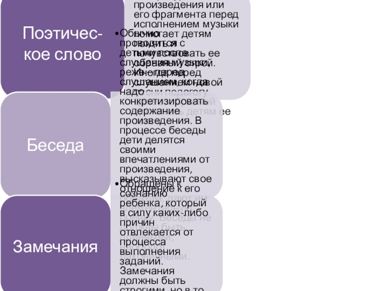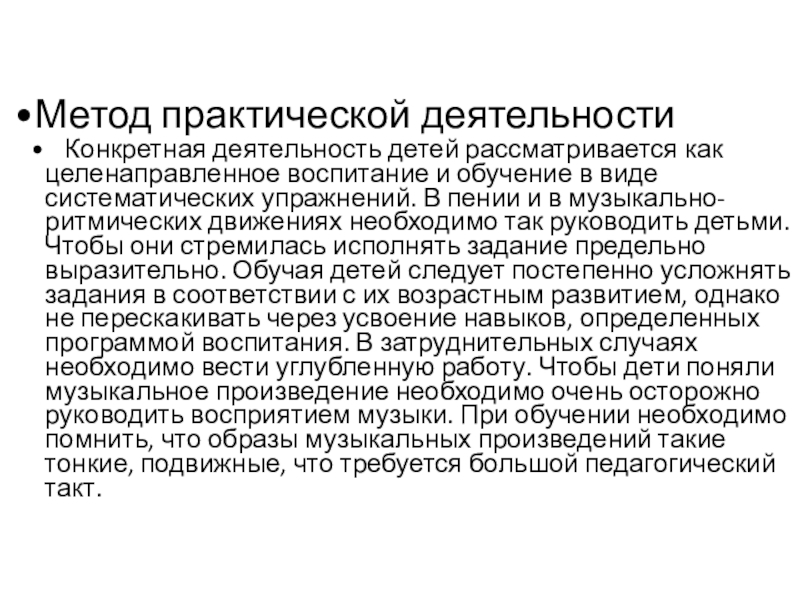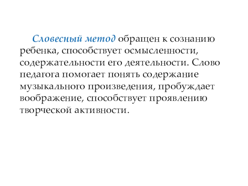 Словесный метод обращен к сознанию ребенка, способствует осмысленности, содержательности его деятельности. Слово педагога помогает понять содержание музыкального