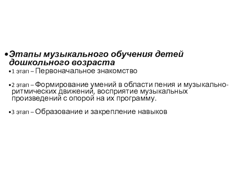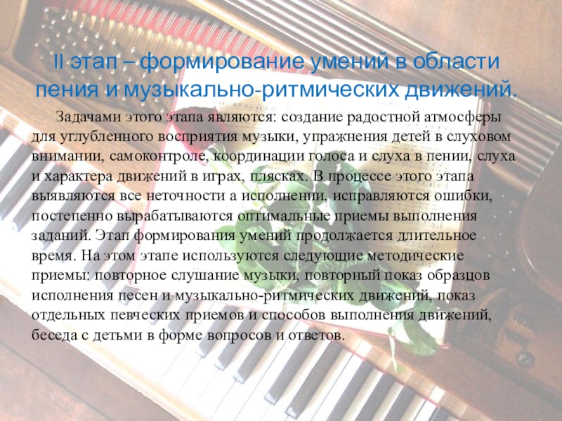 II этап – формирование умений в области пения и музыкально-ритмических движений.   Задачами этого этапа являются: