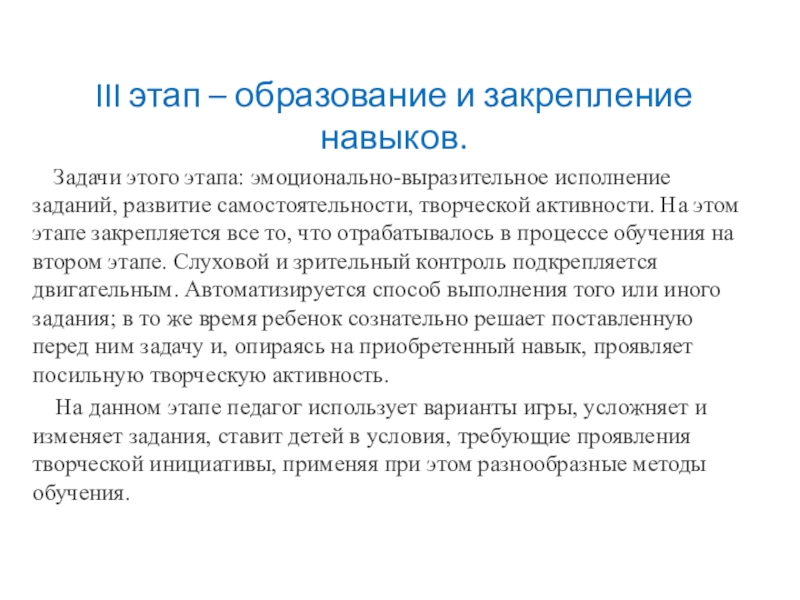 III этап – образование и закрепление навыков.  Задачи этого этапа: эмоционально-выразительное исполнение заданий, развитие самостоятельности, творческой