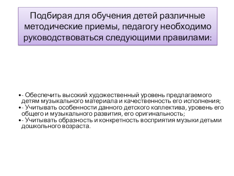 Слайд 5Подбирая для обучения детей различные методические приемы, педагогу необходимо руководствоваться следующими