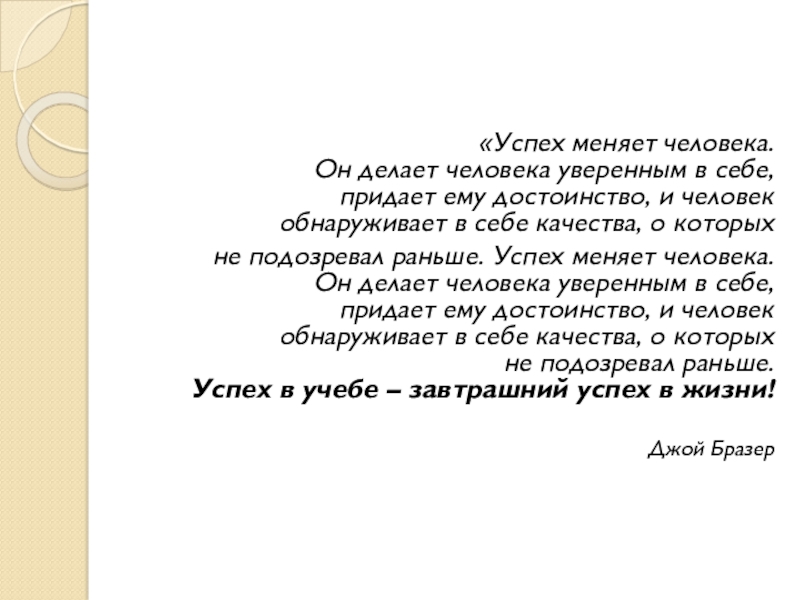 «Успех меняет человека. Он делает человека уверенным в себе, придает ему достоинство, и человек обнаруживает в себе качества, о которых не подозревал раньше. Успех меняет человека. Он делает человека уверенным в себе, придает ему достоинство, и человек обнаруживает в себе качества, о которых не подозревал раньше. Успех в учебе – завтрашний успех в жизни!Джой Бразер