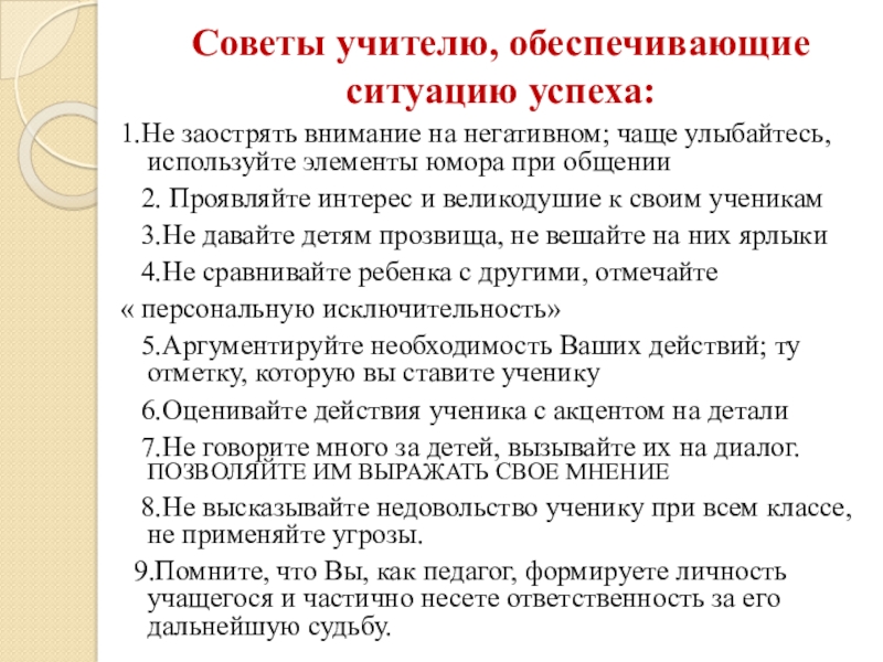 Советы учителю, обеспечивающие ситуацию успеха:1.Не заострять внимание на негативном; чаще улыбайтесь, используйте элементы юмора при общении