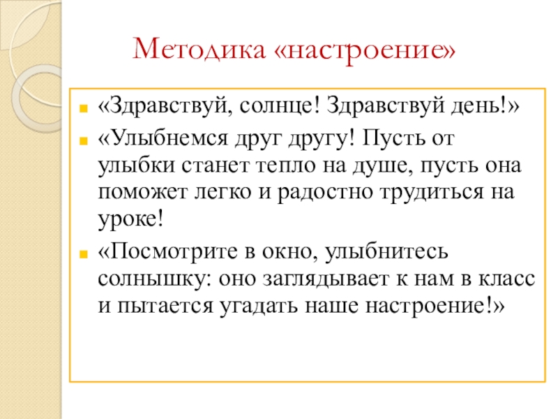 Методика «настроение»«Здравствуй, солнце! Здравствуй день!»«Улыбнемся друг другу! Пусть от улыбки станет тепло на душе, пусть она поможет