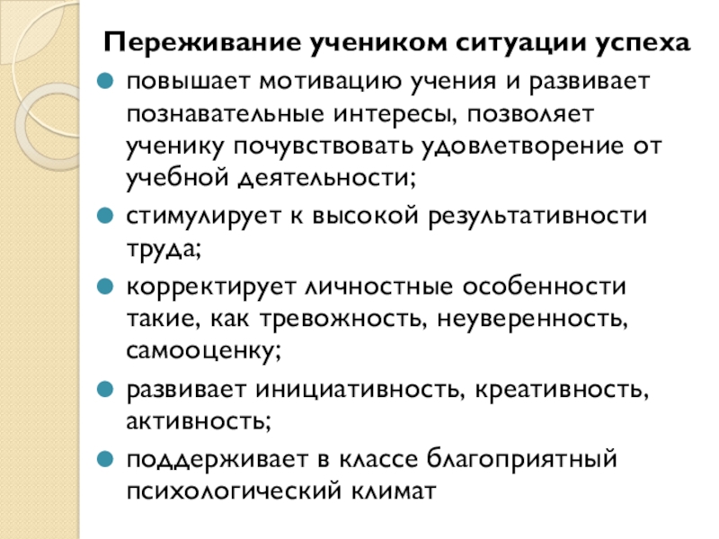 Переживание учеником ситуации успехаповышает мотивацию учения и развивает познавательные интересы, позволяет ученику почувствовать удовлетворение от учебной