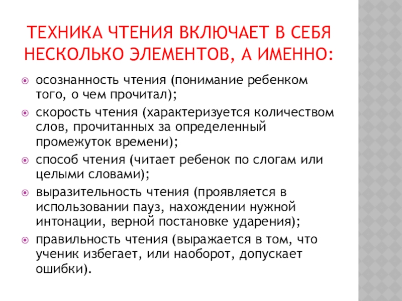 Слайд 8Техника чтения включает в себя несколько элементов, а именно: