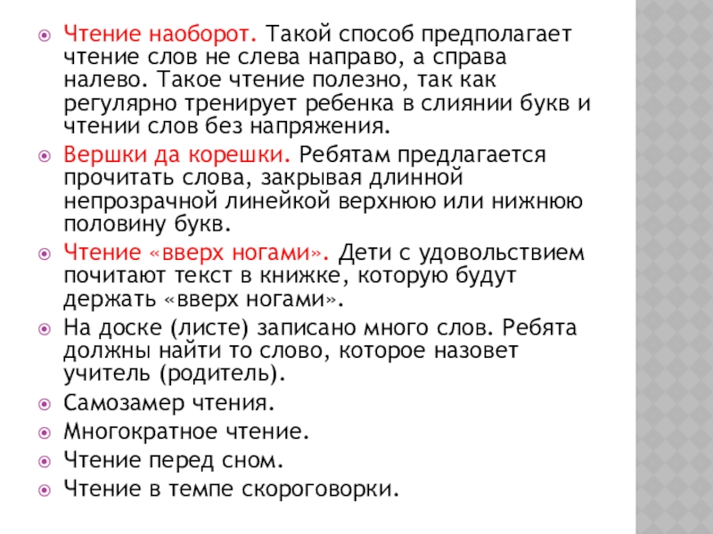 Слайд 10Чтение наоборот. Такой способ предполагает чтение слов не слева направо, а
