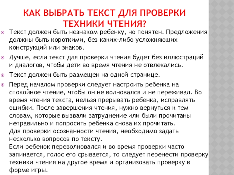 Перед началом проверки следует настроить ребенка на спокойное чтение, чтобы он не волновался и не переживал. Во время чтения текста, нельзя прерывать ребенка, исправлять ошибки. После завершения чтения, нужно вернуться к тем словам, которые вызвали затруднение или были прочитаны неправильно и попросить ребенка снова их прочитать.