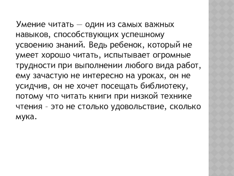 успешному усвоению знаний. Ведь ребенок, который не умеет хорошо читать, испытывает огромные трудности при выполнении любого вида работ, ему зачастую не интересно на уроках, он не усидчив, он не хочет посещать библиотеку, потому что читать книги при низкой технике чтения – это не столько удовольствие, сколько мука.