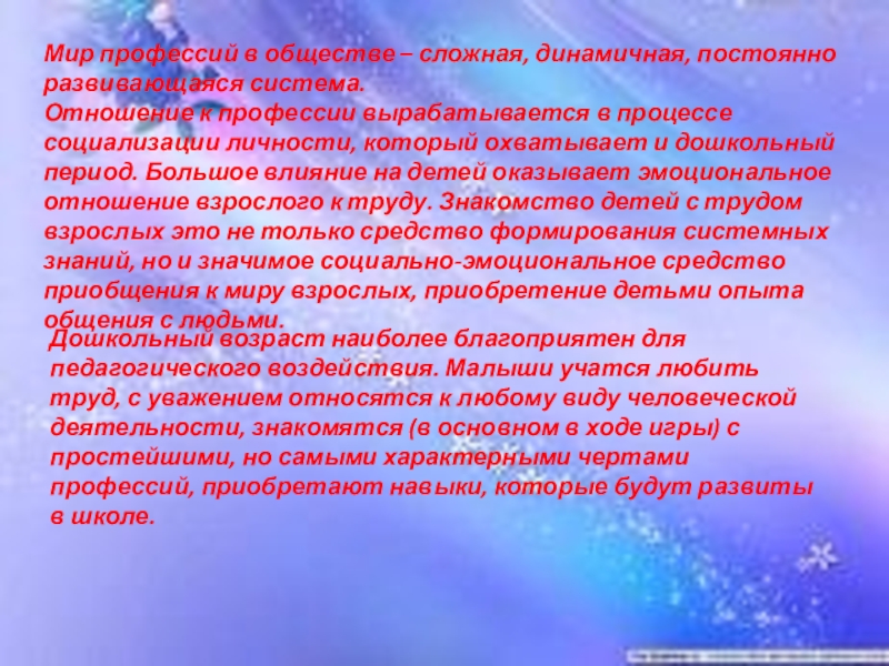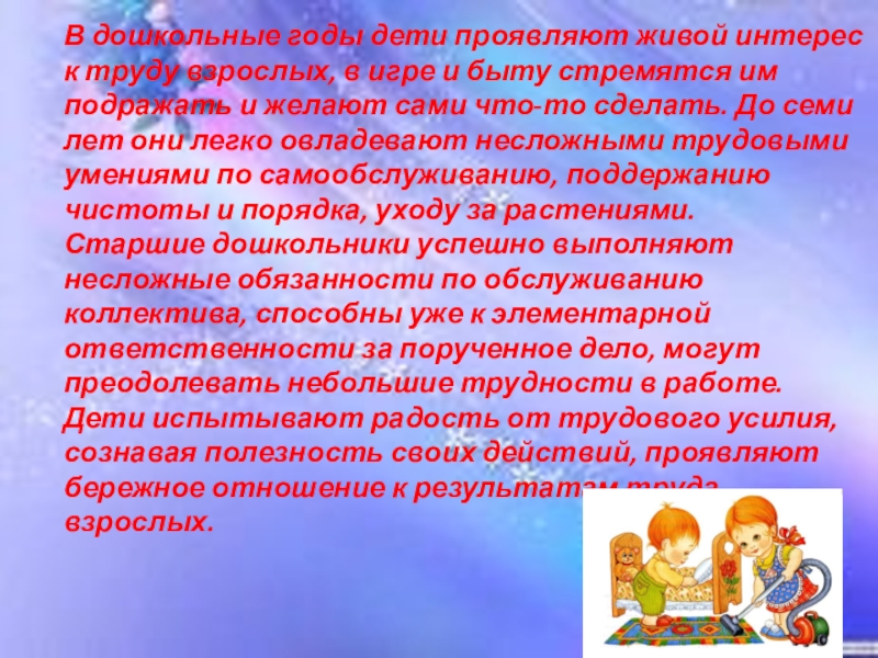 Дошкольный возраст наиболее благоприятен для педагогического воздействия. Малыши учатся любить труд, с уважением относятся к любому виду человеческой деятельности, знакомятся (в основном в ходе игры) с простейшими, но самыми характерными чертами профессий, приобретают навыки, которые будут развиты в школе.