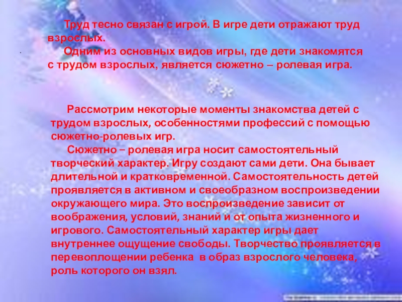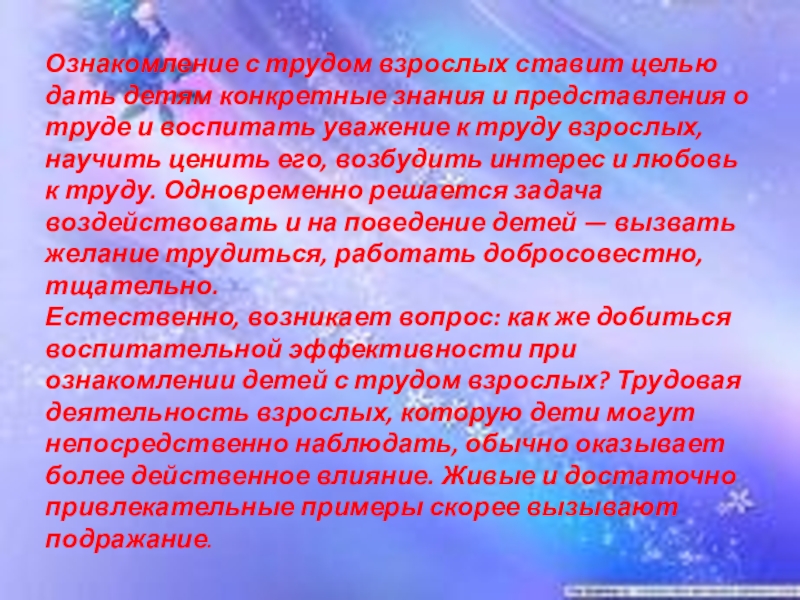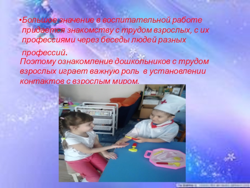 Поэтому ознакомление дошкольников с трудом взрослых играет важную роль в установлении контактов с взрослым миром.
