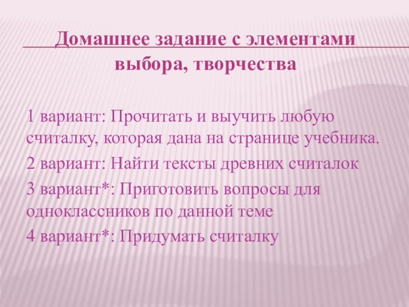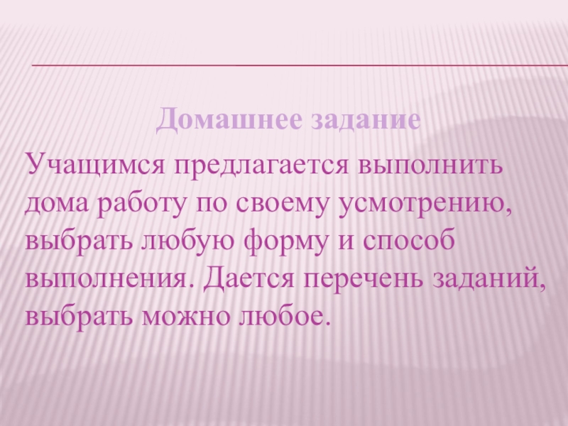 намечаются цели дальнейшей деятельности и определяются задания для самоподготовки (домашнее задание с элементами выбора, творчества)