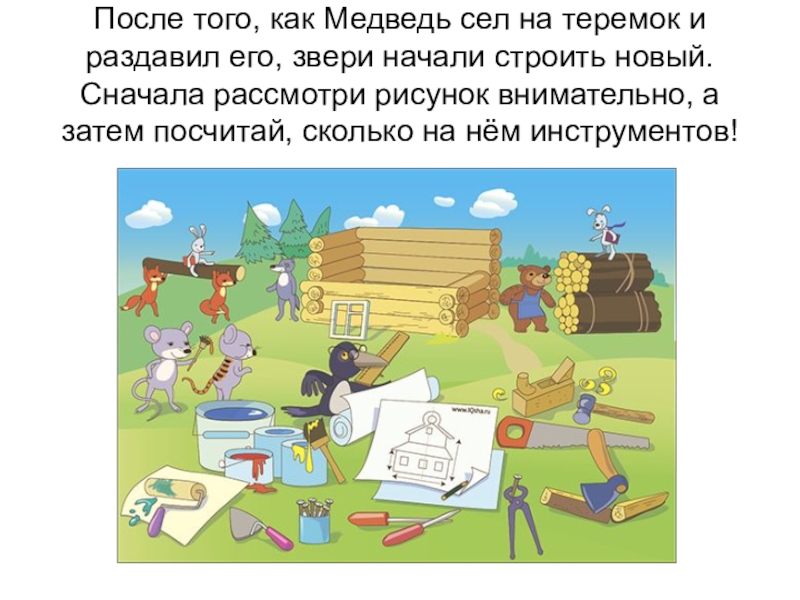 начали строить новый. Сначала рассмотри рисунок внимательно, а затем посчитай, сколько на нём инструментов!
