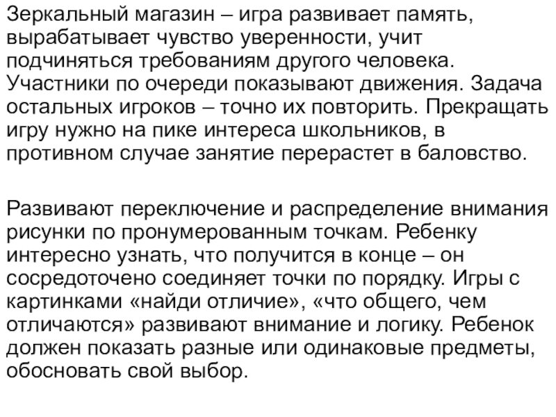 Зеркальный магазин – игра развивает память, вырабатывает чувство уверенности, учит подчиняться
