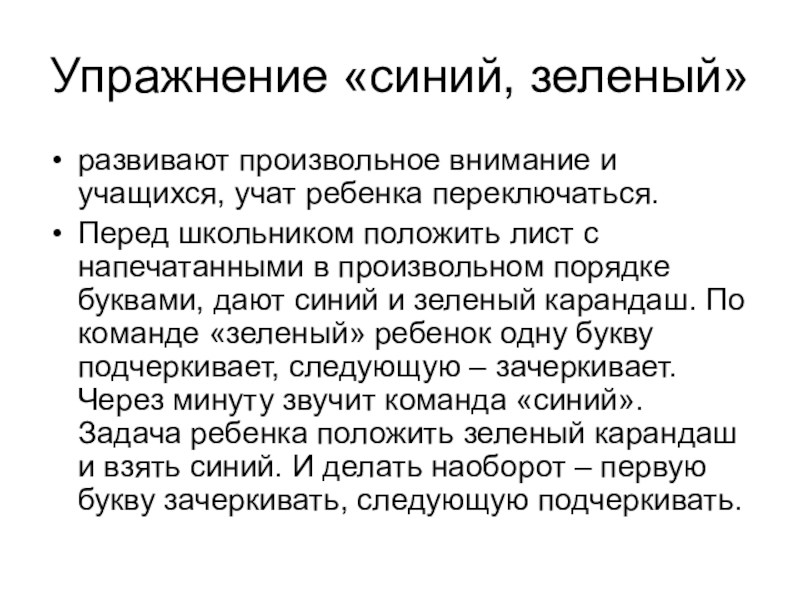 школьником положить лист с напечатанными в произвольном порядке буквами, дают синий и зеленый карандаш. По команде «зеленый» ребенок одну букву подчеркивает, следующую – зачеркивает. Через минуту звучит команда «синий». Задача ребенка положить зеленый карандаш и взять синий. И делать наоборот – первую букву зачеркивать, следующую подчеркивать.
