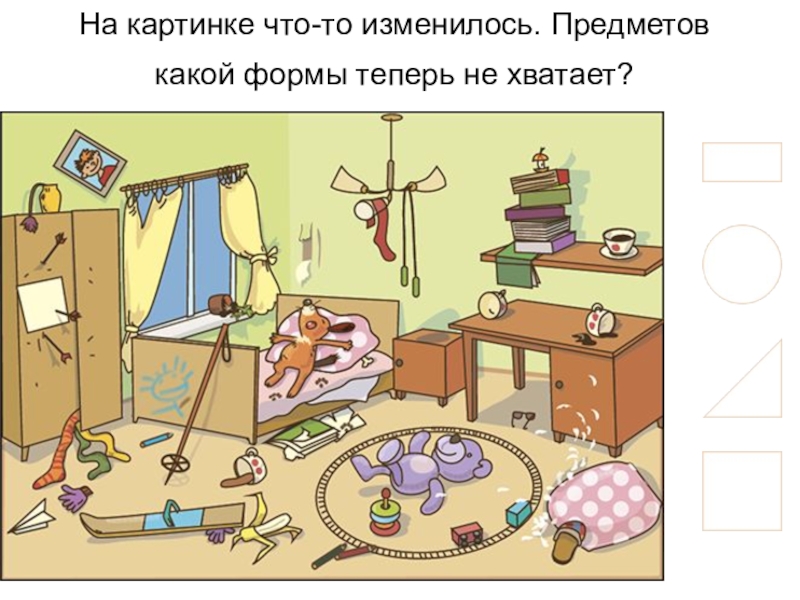 Слайд 25На картинке что-то изменилось. Предметов какой формы теперь не хватает?