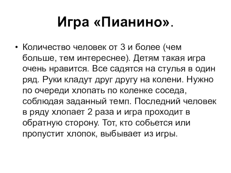 Детям такая игра очень нравится. Все садятся на стулья в один ряд. Руки кладут друг другу на колени. Нужно по очереди хлопать по коленке соседа, соблюдая заданный темп. Последний человек в ряду хлопает 2 раза и игра проходит в обратную сторону. Тот, кто собьется или пропустит хлопок, выбывает из игры.