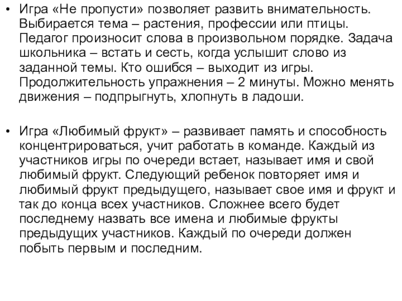 Игра «Любимый фрукт» – развивает память и способность концентрироваться, учит работать в команде. Каждый из участников игры по очереди встает, называет имя и свой любимый фрукт. Следующий ребенок повторяет имя и любимый фрукт предыдущего, называет свое имя и фрукт и так до конца всех участников. Сложнее всего будет последнему назвать все имена и любимые фрукты предыдущих участников. Каждый по очереди должен побыть первым и последним.