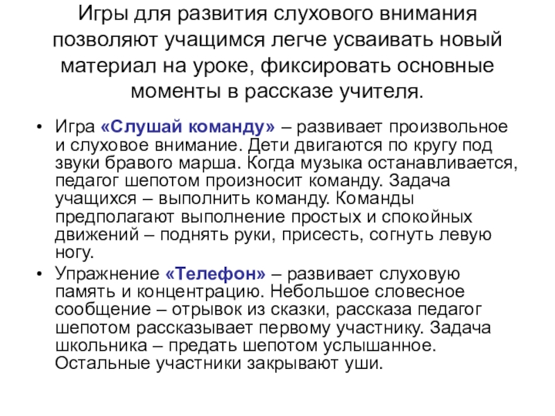 Слайд 32Игры для развития слухового внимания позволяют учащимся легче усваивать новый материал