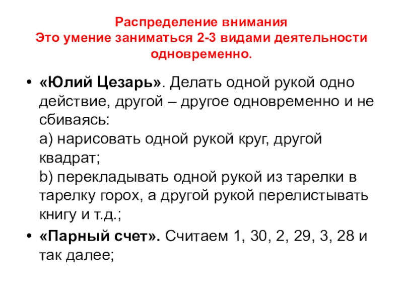 b) перекладывать одной рукой из тарелки в тарелку горох, а другой рукой перелистывать книгу и т.д.;