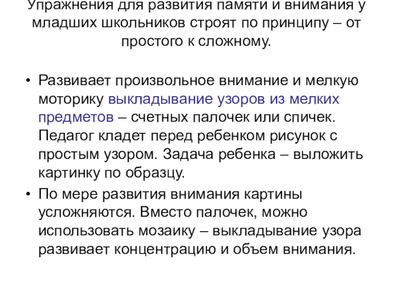 Слайд 28Упражнения для развития памяти и внимания у младших школьников строят по