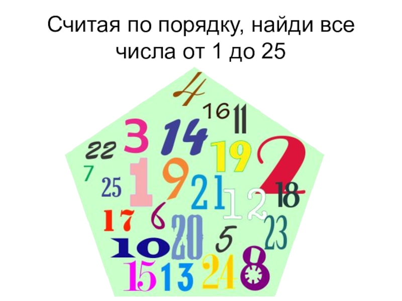 Слайд 14Считая по порядку, найди все числа от 1 до 25