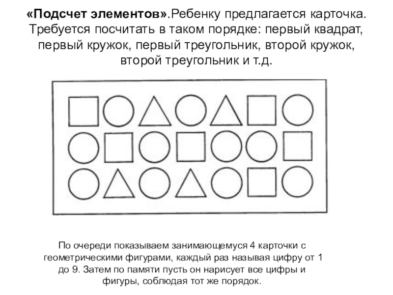 Слайд 9«Подсчет элементов».Ребенку предлагается карточка. Требуется посчитать в таком порядке: первый квадрат,