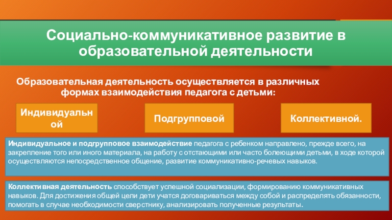 Индивидуальное и подгрупповое взаимодействие педагога с ребенком направлено, прежде всего, на закрепление того или иного материала, на работу с отстающими или часто болеющими детьми, в ходе которой осуществляются непосредственное общение, развитие коммуникативно-речевых навыков.