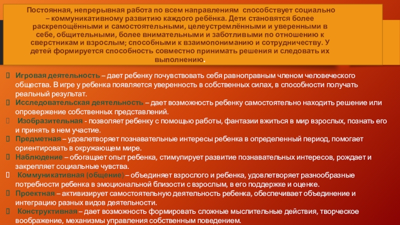 Игровая деятельность – дает ребенку почувствовать себя равноправным членом человеческого общества. В игре у ребенка появляется уверенность в собственных силах, в способности получать реальный результат.
