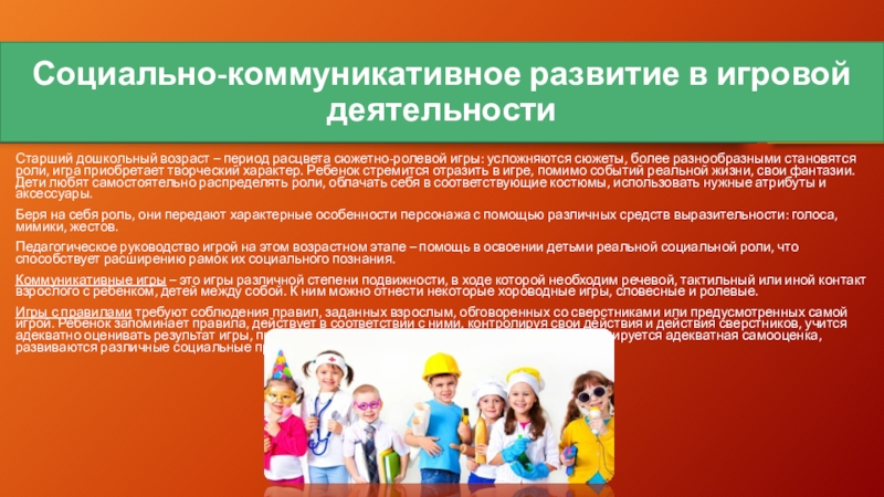 К старшему дошкольному возрасту у ребенка формируется потребность в устойчивых дружеских взаимоотношениях со сверстниками, в эмоциональной близости с ними, в уважении и сопереживании со стороны взрослых. Он способен общаться, ориентируясь на взаимосвязи в социальном мире; иметь устойчивые объединения со сверстниками для игры и реализации общих интересов; проявлять и более гибко использовать коммуникативные умения; способен осознать свое место в группе сверстников.