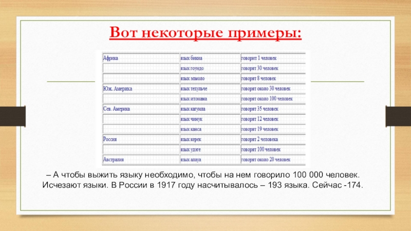 говорило 100 000 человек. Исчезают языки. В России в 1917 году насчитывалось – 193 языка. Сейчас -174.