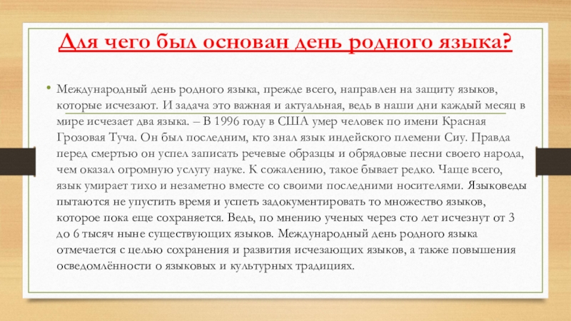 всего, направлен на защиту языков, которые исчезают. И задача это важная и актуальная, ведь в наши дни каждый месяц в мире исчезает два языка. – В 1996 году в США умер человек по имени Красная Грозовая Туча. Он был последним, кто знал язык индейского племени Сиу. Правда перед смертью он успел записать речевые образцы и обрядовые песни своего народа, чем оказал огромную услугу науке. К сожалению, такое бывает редко. Чаще всего, язык умирает тихо и незаметно вместе со своими последними носителями. Языковеды пытаются не упустить время и успеть задокументировать то множество языков, которое пока еще сохраняется. Ведь, по мнению ученых через сто лет исчезнут от 3 до 6 тысяч ныне существующих языков. Международный день родного языка отмечается с целью сохранения и развития исчезающих языков, а также повышения осведомлённости о языковых и культурных традициях.