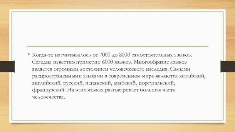 6000 языков. Многообразие языков является огромным достоянием человеческого наследия. Самыми распространенными языками в современном мире являются китайский, английский, русский, испанский, арабский, португальский, французский. На этих языках разговаривает большая часть человечества.