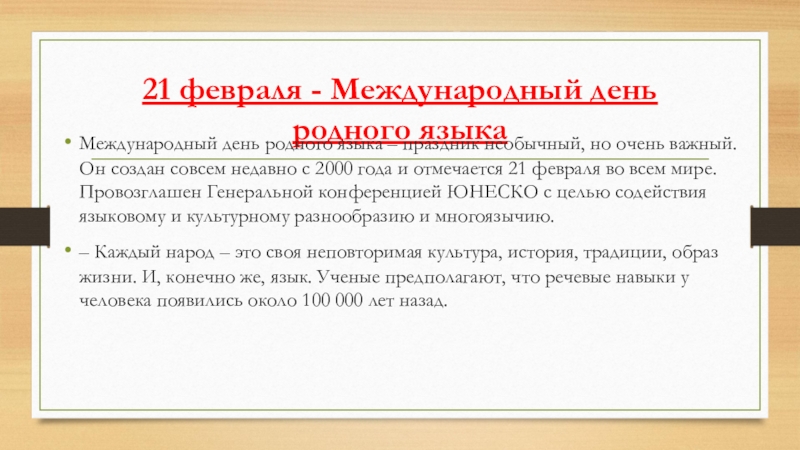– праздник необычный, но очень важный. Он создан совсем недавно с 2000 года и отмечается 21 февраля во всем мире. Провозглашен Генеральной конференцией ЮНЕСКО с целью содействия языковому и культурному разнообразию и многоязычию.