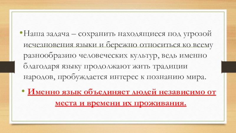 Слайд 8Наша задача – сохранить находящиеся под угрозой исчезновения языки и бережно