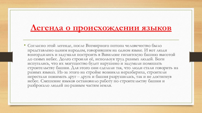 представлено одним народом, говорившим на одном языке. И вот люди возгордились и задумали построить в Вавилоне гигантскую башню высотой до самых небес. Долго строили её, используя труд разных людей. Боги испугались, что их могущество будет нарушено и задумали помешать строительству башни. Для этого они сделали так, что люди стали говорить на разных языках. Из-за этого на стройке возникла неразбериха, строители перестали понимать друг – друга и башня разрушилась, так и не достигнув небес. Смешение языков остановило работу по строительству башни и разбросало людей по разным частям земли.
