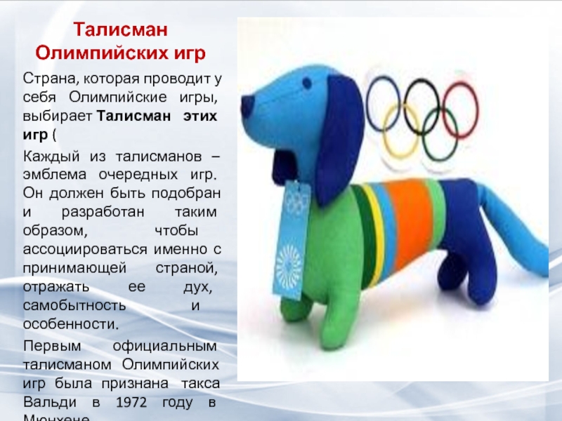 Первым официальным талисманом Олимпийских игр была признана такса Вальди в 1972 году в Мюнхене.