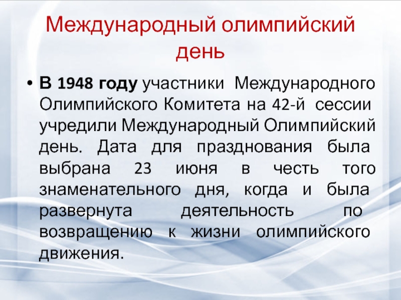 учредили Международный Олимпийский день. Дата для празднования была выбрана 23 июня в честь того знаменательного дня, когда и была развернута деятельность по возвращению к жизни олимпийского движения.