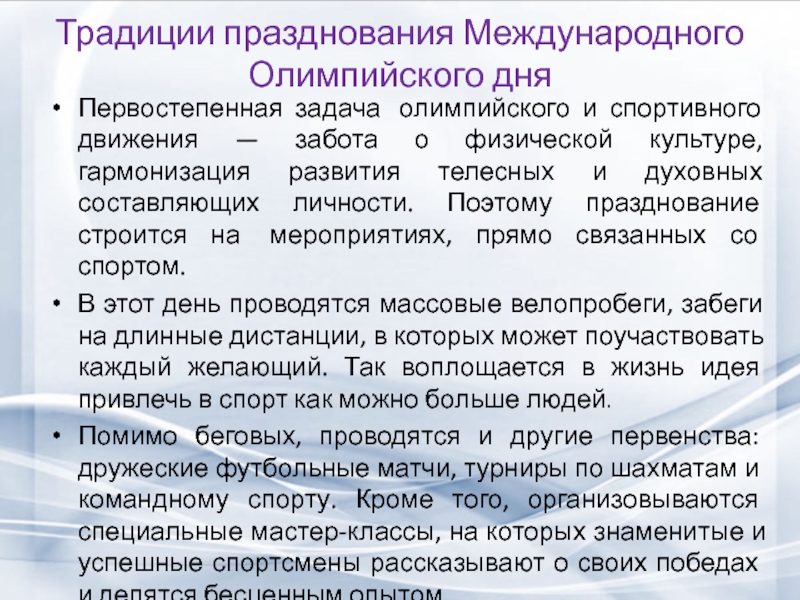 Слайд 18Традиции празднования Международного Олимпийского дня