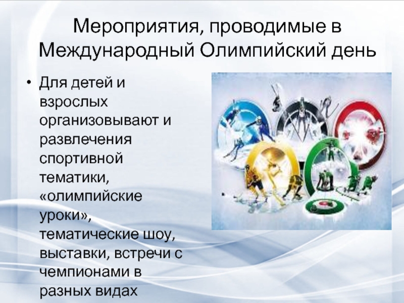 Слайд 19Мероприятия, проводимые в Международный Олимпийский день