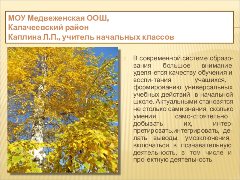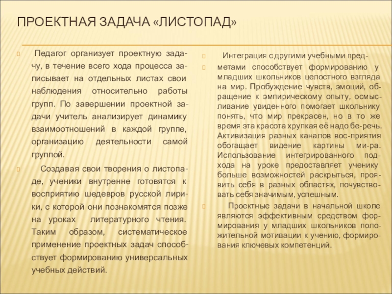 Создавая свои творения о листопа-де, ученики внутренне готовятся к восприятию шедевров русской лири-ки, с которой они познакомятся позже на уроках литературного чтения. Таким образом, систематическое применение проектных задач способ-ствует формированию универсальных учебных действий.