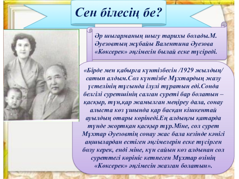 «Бірде мен қабырға күнтізбесін /1929 жылдың/ сатып алдым.Сол күнтізбе Мұхтардың жазу үстелінің тұсында ілулі тұратын еді.Сонда белгілі суретшінің салған суреті бар болатын – қасқыр, түн,қар жамылған меңіреу дала, сонау алыста көз ұшында қар басқан кішкентай ауылдың отары көрінеді.Ең алдыңғы қатарда түнде жортқан қасқыр тұр.Міне, сол сурет Мұхтар Әуезовтің сонау жас бала кезінде кәнігі аңшылардан естіген әңгімелерін еске түсірген болу керек, енді міне, күн сайын көз алдынан сол суреттегі көрініс кетпеген Мұхтар өзінің «Көксерек» әңгімесін жазған болатын».