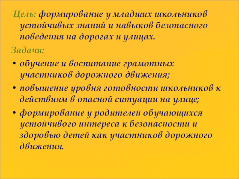 Слайд 2 Цель: формирование у младших школьников устойчивых знаний и навыков безопасного