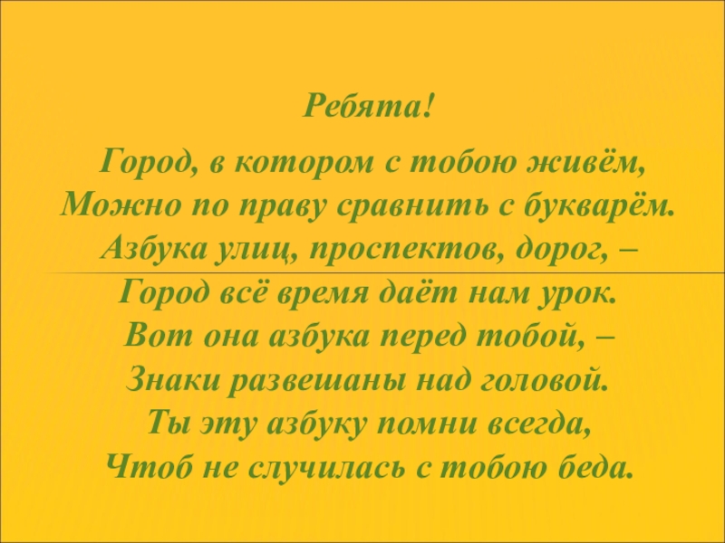 положенном месте и только на зелёный свет. Прежде, чем перейти дорогу, посмотри налево, дойдя до середины дороги– направо, убедись в отсутствии транспорта