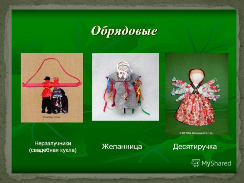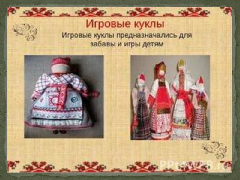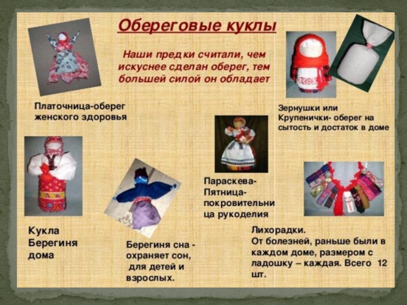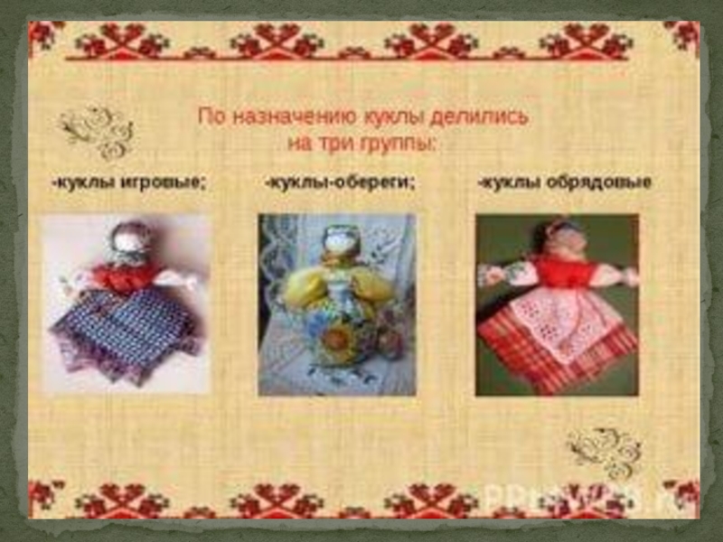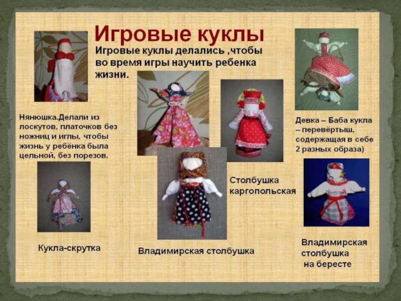 Развивать интерес к культурным ценностям и традициям своего народа. 3. Развивать познавательные способности, творческое воображение, художественный вкус. 4. Знакомить детей с историей и видами тряпичных народных кукол. 5. Формировать интерес, эмоциональную отзывчивость, чувство радости от встречи с куклами.