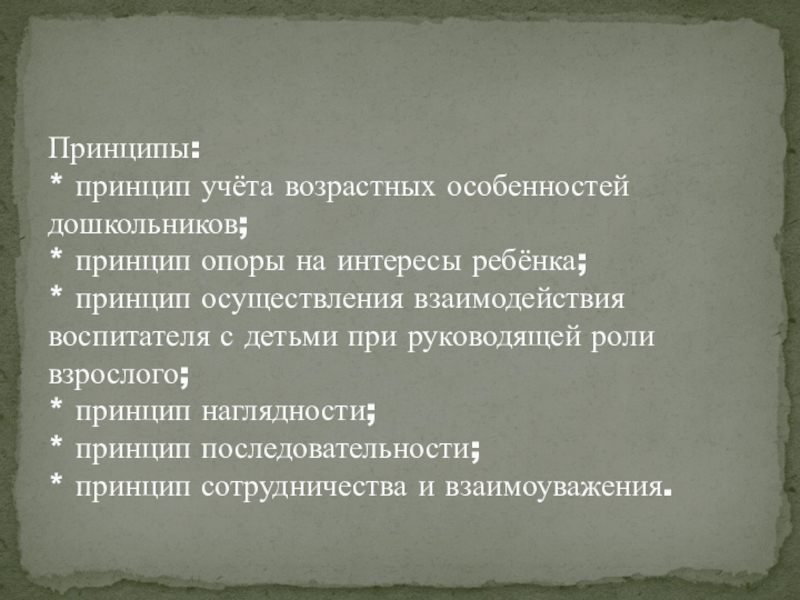 Принципы: * принцип учёта возрастных особенностей дошкольников; * принцип опоры на интересы ребёнка; * принцип осуществления взаимодействия