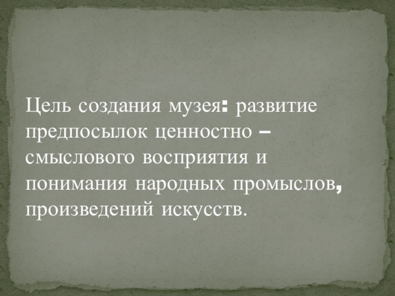 Цель создания музея: развитие предпосылок ценностно – смыслового восприятия и понимания народных промыслов, произведений искусств.