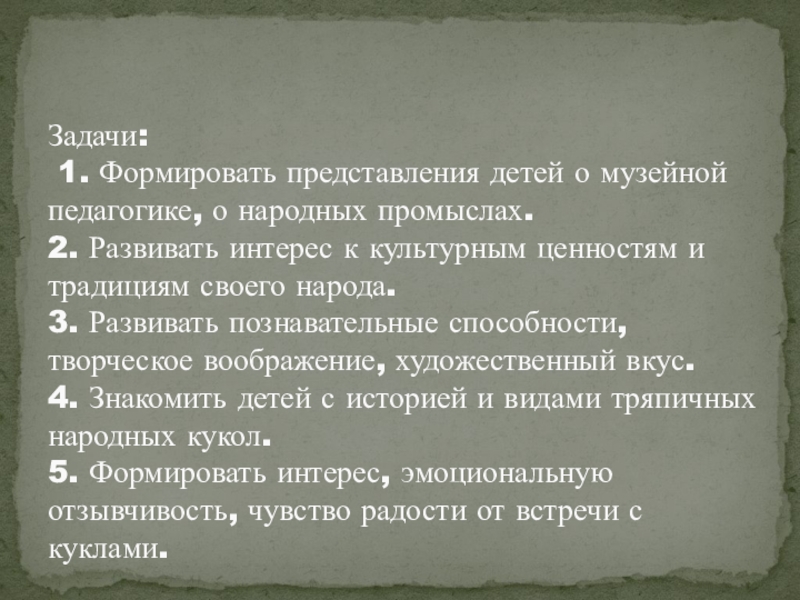Задачи:  1. Формировать представления детей о музейной педагогике, о народных промыслах. 2. Развивать интерес