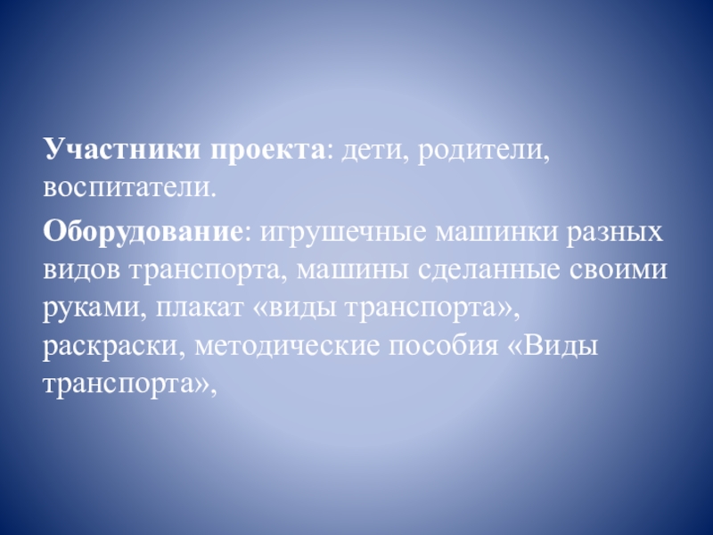 Оборудование: игрушечные машинки разных видов транспорта, машины