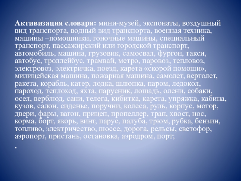 Слайд 15Активизация словаря: мини-музей, экспонаты, воздушный вид транспорта, водный вид транспорта, военная